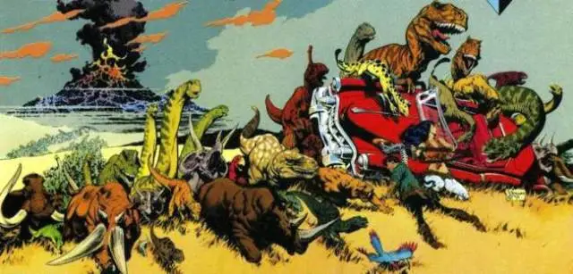 不知道为啥最近都看不到这种片子了。在这个题材上,僵尸片已经拍得差不多了,让恐龙在废墟上奔跑吧!不管怎么说,1990年的电影《原始美少女身陷恐龙大魔窟》(A Nymphoid Barbarian in Dinosaur Hell)(注:若要观看,责任自负)里的变异恐龙就粗糙地实现了这个想法。当然,其他的一些作品,如马克•舒尔茨(Mark Schultz)的《史前异形传说》(Xenozoic Tales)就有更丰富的细节,而且写作之前考虑得更加周到。该故事讲述了恐龙及其他史前生物在人类用环境危机把自己作死之后再次占领地球的故事。当然,这些恐龙并不是空降到故事里来的——舒尔茨表示,这些变种蜥蜴能存活是因为造物主一开始有些失控。此人决定强行倒带,让进化的力量知道恐龙才是物种的顶峰。你看,这有什么好吵吵的。