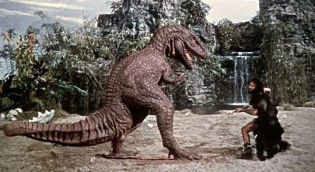 你看这个想法就特别有创意。他们没有把霸王龙剑齿龙之类的非禽类恐龙在现代复活,而是强行穿越到几千万年前的谜之时空。在那个年代,兽脚亚目恐龙整天拖着尾巴追逐身穿剑齿虎皮比基尼的妹子。《公元前一百万年》(One Million Years B.C.)和《恐龙纪》(When Dinosaurs Rules the Earth)就是该分支流派下的分支流派下的分支流派的优秀代表。不过除此之外,本题材涵盖了从《摩登原始人》(The Flintstones)和漫威的《蛮荒之地》(Savage Land)至有林格•达尔(Ringo Starr)苦着脸开车的《穴居人》(Cavemen)等多种多样的影片。