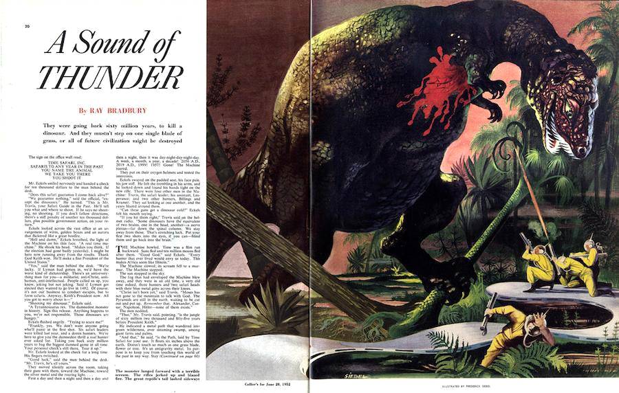 这或许和“失落的世界”这个设定一脉相承,不过它已经有能力自成一派了:把某史前生物或它的蛋冻起来,就可以方便快捷地把它保留到现代,还不用解释它怎么没在千百万年中的时间长河中灭绝这种问题。《原子怪兽》(The Beast from 20,000 Fathoms)里的远古怪兽Rhedosaurus就这么逃过了灭绝。雷•克拉克(Leigh Clark)的《食肉动物》(Carnivore)里那只情绪暴躁而且永远吃不饱的霸王龙也是。当然,如果你非要钻一些科学问题的牛角尖,比方说中生代恐龙解冻后要过多久才能从表皮干燥变硬加冻伤的过程中恢复过来,科学家们也只能保持沉默了。