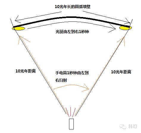 如图所示,手电筒向10光年以外的墙壁扫射,过程1秒钟,【10年后】,光斑首先出现在墙的左端,并迅速向右移动,【再过1秒后】,移动到了10光年远的墙的另一端,光斑速度远超光速。