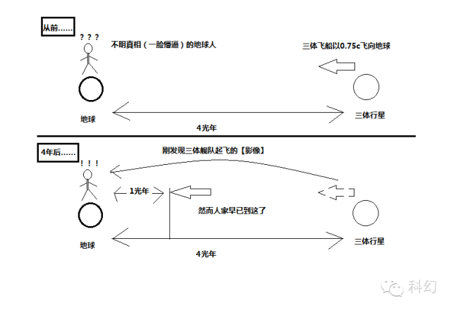 假设三体舰队以0.75c速度从母星出发入侵地球,由于距离问题,它们刚出发师,地球人并不知道(一脸懵逼),知道4年后,它们出发的影像才以光为载体传播到地球,地球通过望远镜看到。然而此时的三体舰队本体早已走了0.75c*4=3光年,距离地球只剩1光年了,地球人却仅凭望远镜以为三体人刚出发。。。。再过1.33年,三体舰队本体到了地球,地球人在这1.33年内通过望远镜看到飞船影像走了4光年,影像速度为3倍光速。