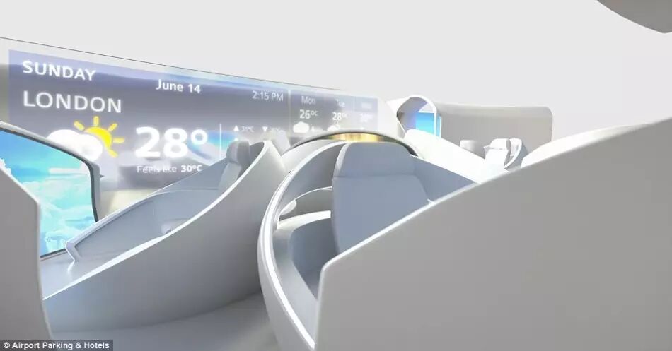 最惊人的是,这款概念机的窗户非常少,因为舷窗会让部分乘客在飞行时感觉不舒服。取而代之的是透明的LCD屏,可以投射出窗外的景色,或者播放飞机娱乐系统中的电影、电视节目或地图,或是放映令人感到放松的景象,帮助乘客入眠。