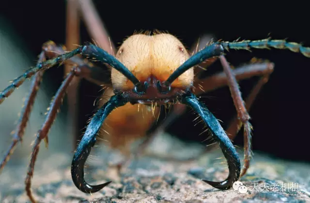 这是一只军蚁头部与下颚的特写镜头。迁移时工蚁们的职责包括搬运未成熟的蚁蛹。