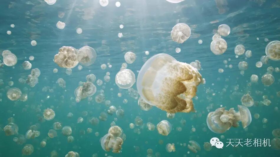 帕劳金色水母因单细胞生物虫黄藻而呈现金色。虫黄藻在水母中生活,为水母提供维持生命所需的能量。它们每天跟随太阳迁徙,喂饱了“过客”,也确保了它们的生存。