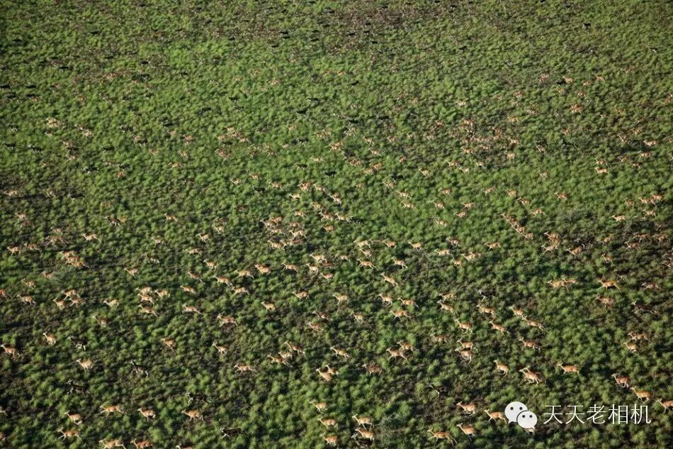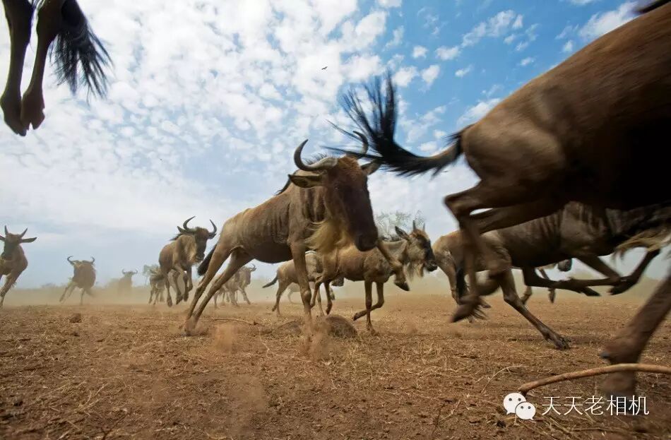 肯尼亚马塞马拉国家动物保护区干涸平原上奔跑的角马群。每年,角马迁徙1800英里(2900公里)跨越非洲东部赤道朝着多雨而绿色植物充盈的地区奔去。