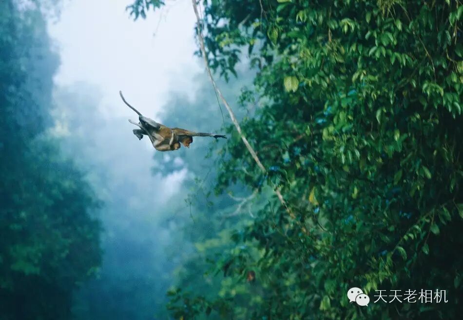 在婆罗洲森林中,一只抱着幼儿的长鼻猴惊人一跃。