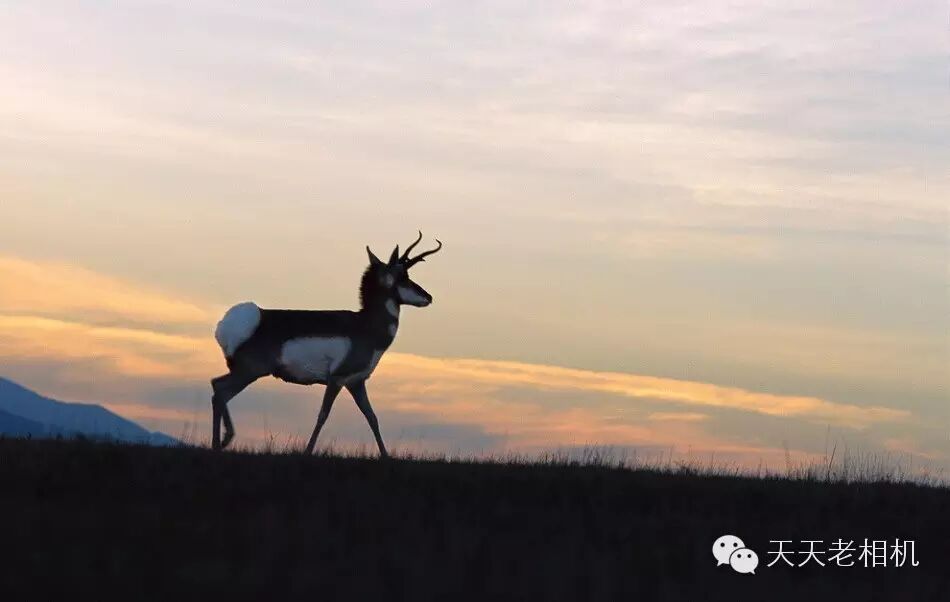美国俄勒冈心山国家羚羊保护区,一只叉角羚在黄昏中留下的美丽的侧影。