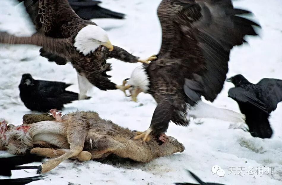 春天,秃头鹰沿密西西比河走廊迁徙,前往加拿大与美国北部的繁殖地,去寻找充足的食物资源,有时候,大乌鸦会加入它们的美食盛宴。