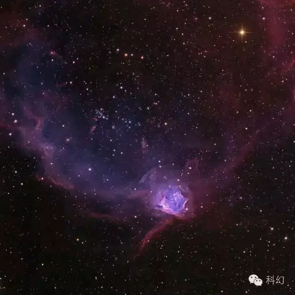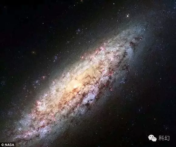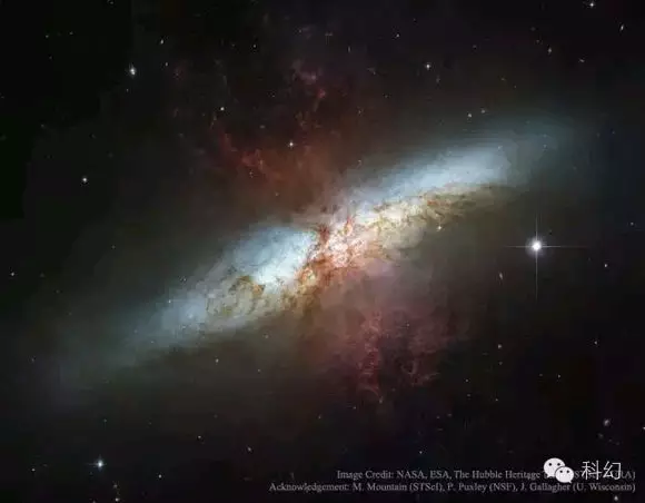 这个不规则星系又名为M82,因为最近通过大螺旋星系M81附近而受到扰动。不过,这不足以完全解释这些向外扩张的泛红辉光气体之起源。证据显示这些气体,是受到许多恒星粒子风加总起来的星系超级风之驱策才泛流而出。这张并接主题影像,突显了电离氢气所发出的特定波长红光,以呈现这些气体内长度超过1万光年的纤细丝状构造。