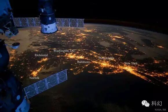 光从都市灯火,你能认出美国东北部的熟悉区域吗?从右到左包括:纽约、费城、巴尔的摩、华盛顿特区、里士满及诺福克,然而名列美国东北部大都会的波士顿并不在影像视野里。全世界最大的公司之中,大约有十分之一的总部设置在此。而几乎绵延不间断的灯火,也似在佐证1960年代的预言:这个区域将演变成单一个大都市。